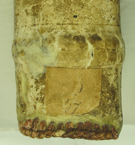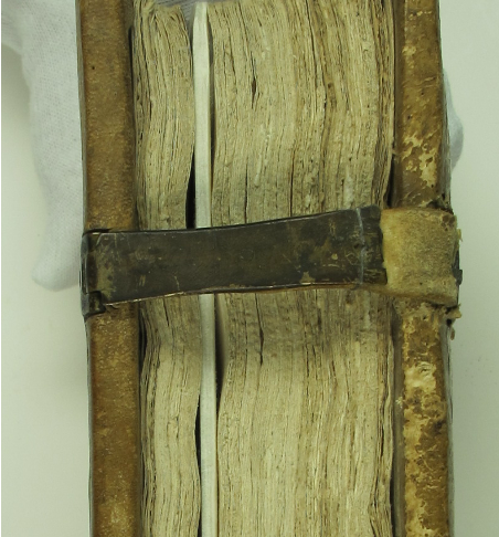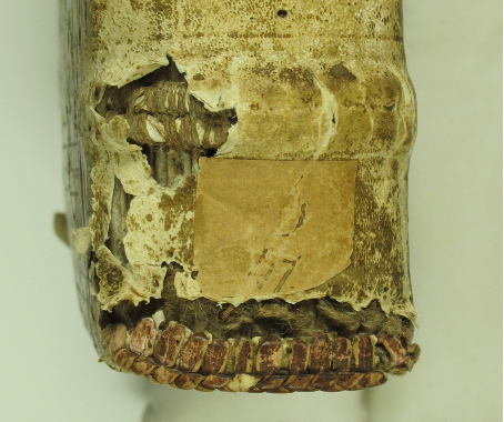 La réponse se trouve à l’intérieur du livre. Un grand vide béant apparaît dans le bloc du livre et, en y regardant de plus près, on remarque des morceaux de fil de reliure apparemment superflus et on constate également que les nerfs du pauvre volume sont cassés. On s’aperçoit alors qu’il manque des pages ! Des pages qui auraient soutenu les nerfs de manière uniforme et les auraient protégés contre les pliures et les cassures. Des pages qui auraient donné au bloc du livre le volume pour lequel les fermoirs étaient autrefois adaptés. Les pages auraient également rempli le dos de la reliure, qui aurait conservé sa belle courbure au lieu de s’affaisser à cause du vide. Le dos aurait-il alors été épargné des déchirures et des lacunes ? On ne peut pas le dire avec certitude, mais la déformation n’a certainement pas aidé.