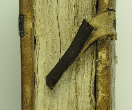 Le temps a laissé des traces : la partie inférieure du dos est usée, le pied de page inférieur est presque entièrement déchiré. Malheureusement, rien d’inhabituel jusqu’à présent, si ce n’est une boucle tristement pendante… Pourquoi ne tient-elle plus ?