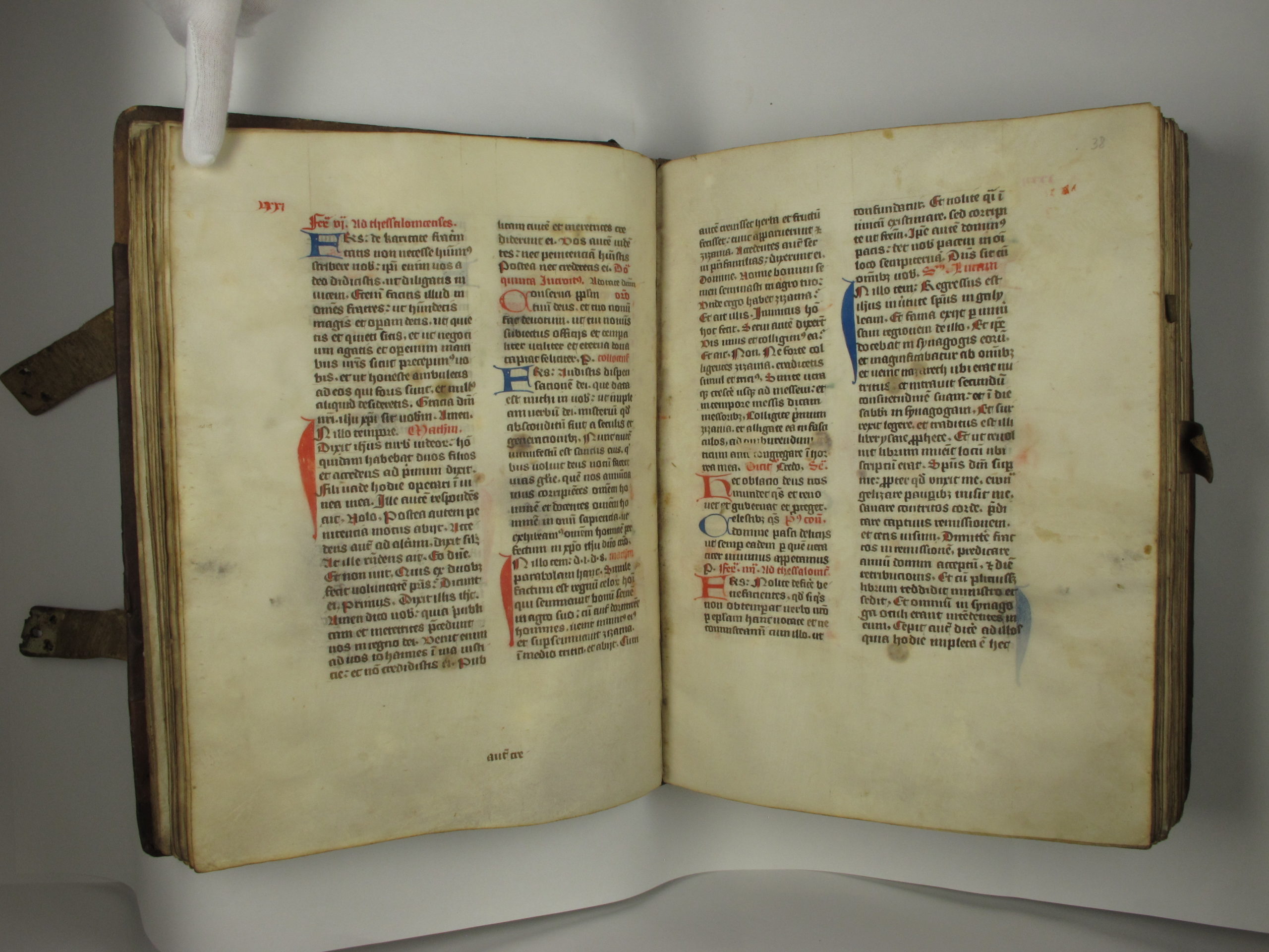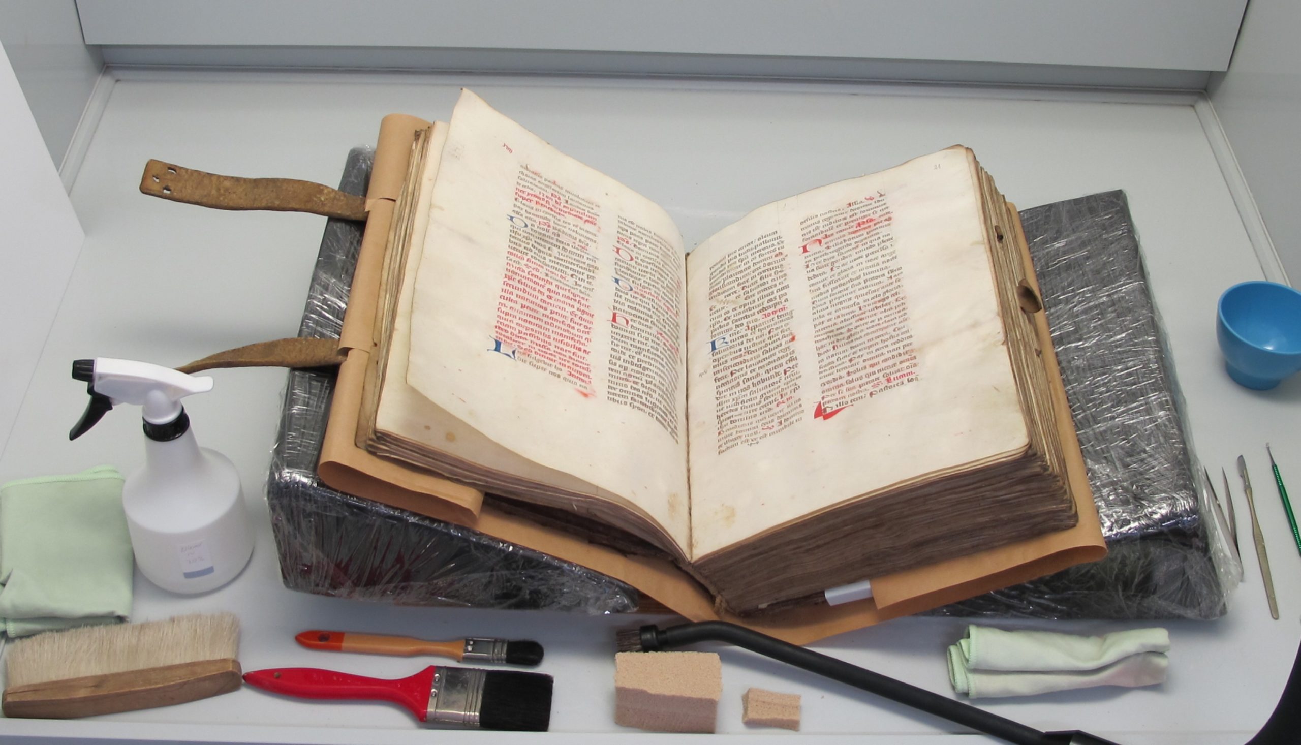 Au lieu de remplacer le matériau d’origine endommagé par du neuf, celui-ci est consolidé et renforcé. Pour ce faire, la couverture en cuir est détachée et retirée des ais. Ainsi, pendant le traitement, le bloc du livre avec les ais est temporairement « à nu », relevant la construction du volume.